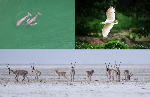 這是一張拼版照片:左上圖為在湖北省宜昌市江邊,長江江豚在水中嬉戲(無人機(jī)照片,新華社記者肖藝九5月11日攝);右上圖為陜西省漢中市洋縣朱鹮生態(tài)園內(nèi)的朱鹮(新華社記者劉瀟5月13日攝);下圖為藏羚羊在三江源可可西里地區(qū)活動(dòng)(新華社記者吳剛4月20日攝)。新華社發(fā)