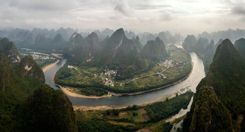 這是2018年10月18日拍攝的廣西桂林陽朔縣興坪鎮(zhèn)的漓江景色(無人機(jī)拼接照片)。新華社記者 李鑫 攝