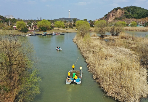 2021年2月24日,浙江湖州吳興區(qū)八里店鎮(zhèn)移沿山村河長帶隊(duì)在移沿山村開展巡河、保潔作業(yè)(無人機(jī)照片)。新華社記者 翁忻旸 攝