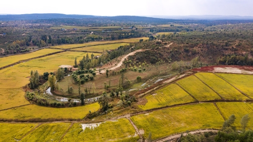 2020年9月26日拍攝的陜西省靖邊縣黃蒿界鎮(zhèn)馬季溝村稻田(無人機(jī)照片)。近年來,靖邊縣實(shí)施了“三北”防護(hù)林、退耕還林、流域治理等生態(tài)建設(shè)工程,北部沙漠區(qū)裸露明沙完全消失,中部農(nóng)田林網(wǎng)蔚然成蔭,南部山區(qū)夏季綠色滿山。新華社記者 陶明 攝