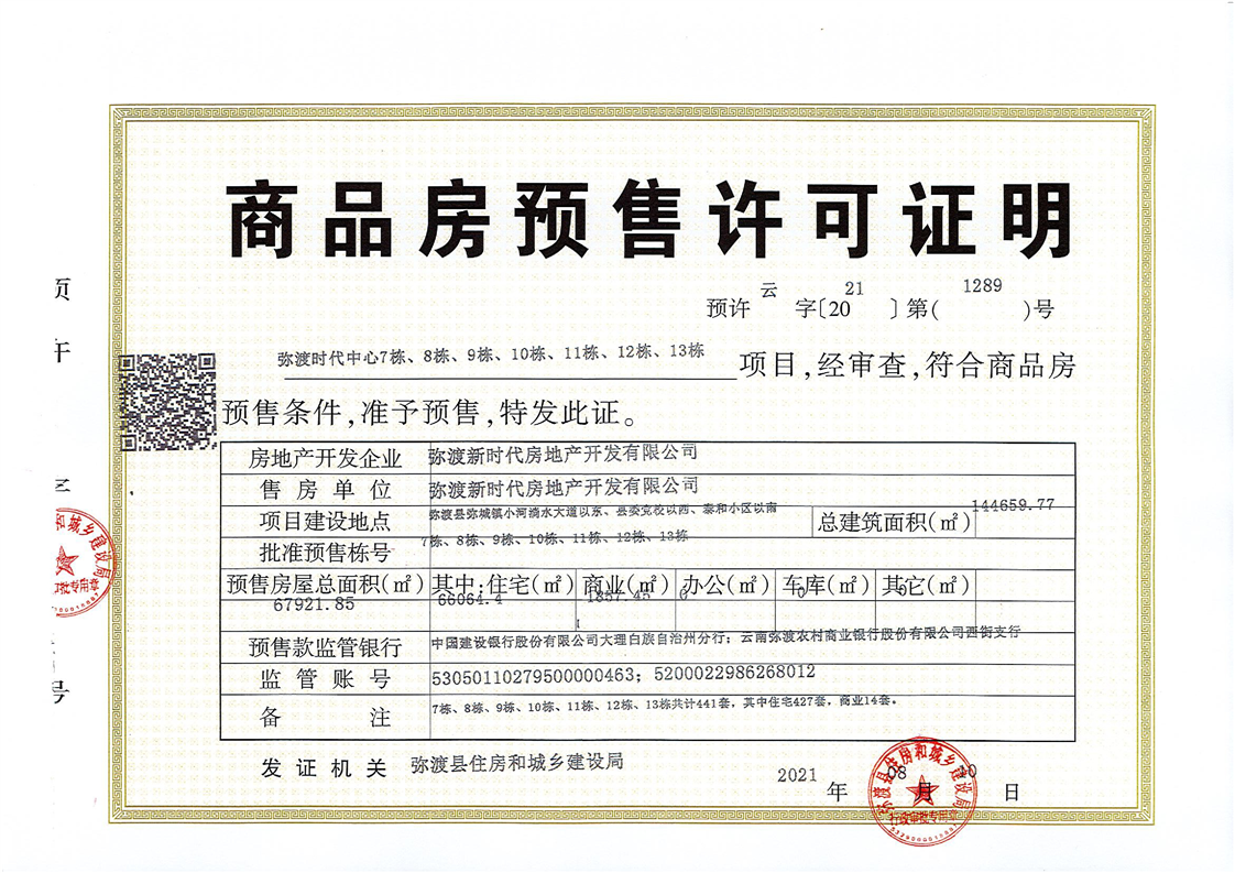 大理市彌渡時代中心7—13棟商品房預(yù)售許可證明