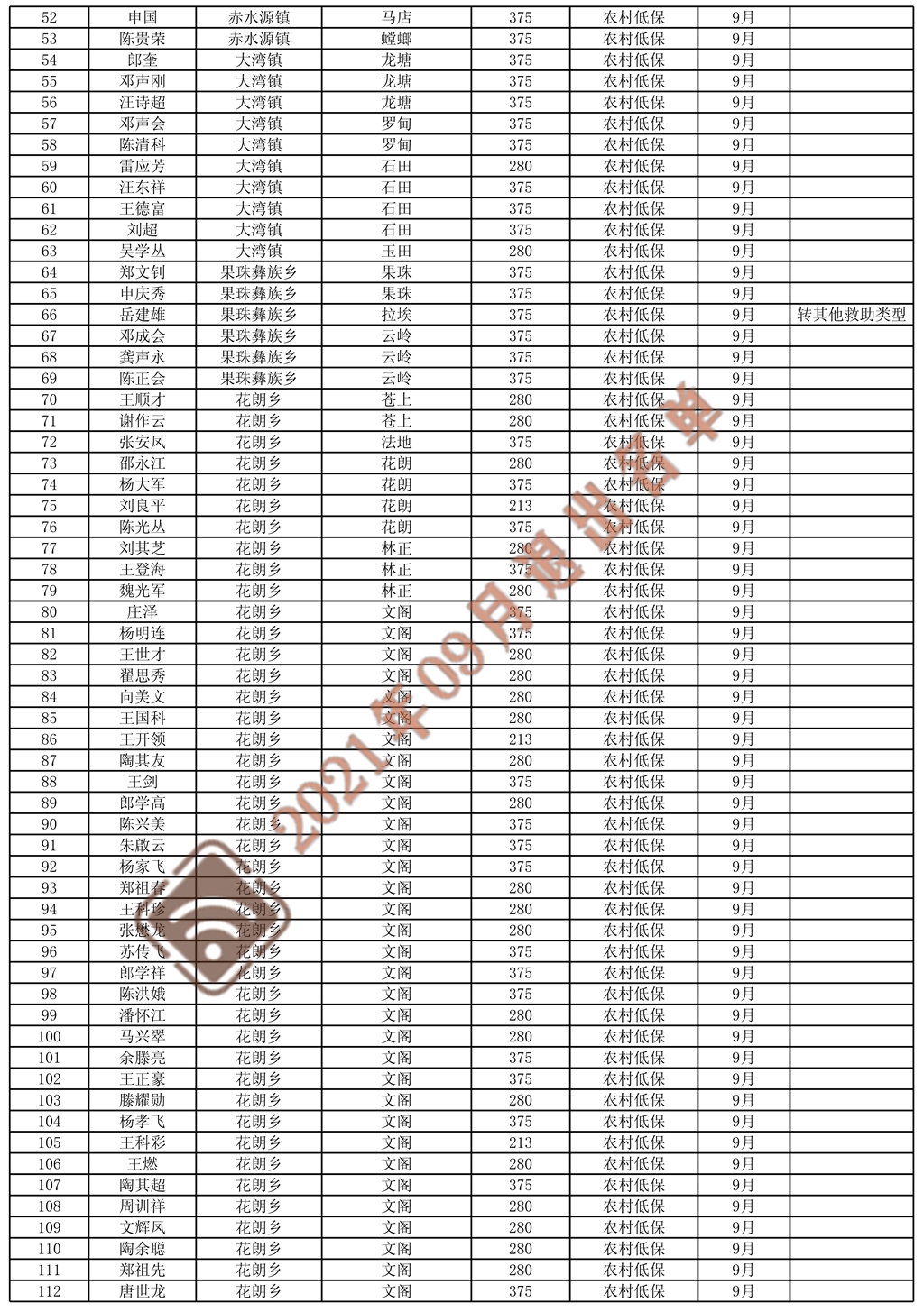 2021年9月份退出城鄉(xiāng)低保和特困人員名單