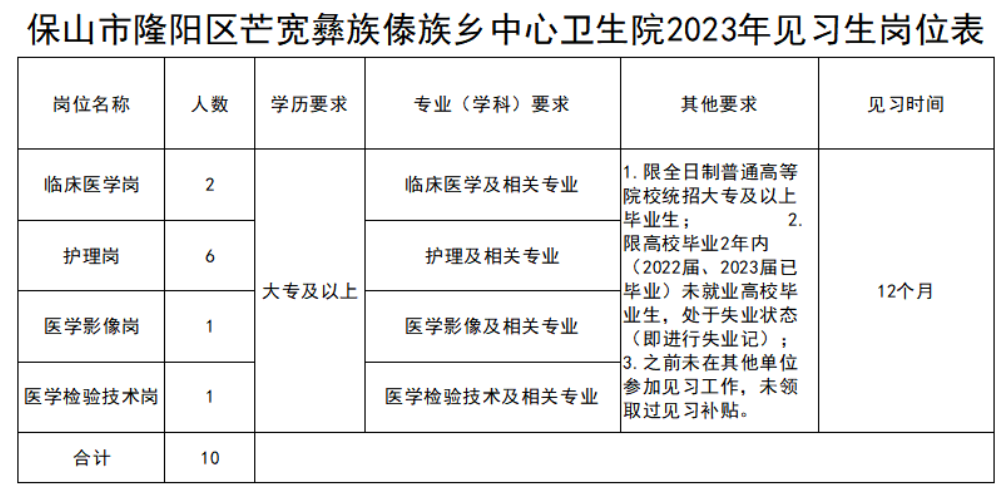本次招聘見習生10人,其中:臨床醫(yī)學崗:2人;護理崗:6人;醫(yī)學影像技術崗:1人;醫(yī)學檢驗技術崗:1人;詳見附件1:《保山市隆陽區(qū)芒寬彝族傣族鄉(xiāng)中心衛(wèi)生院2023年招聘見習人員崗位設置表》。