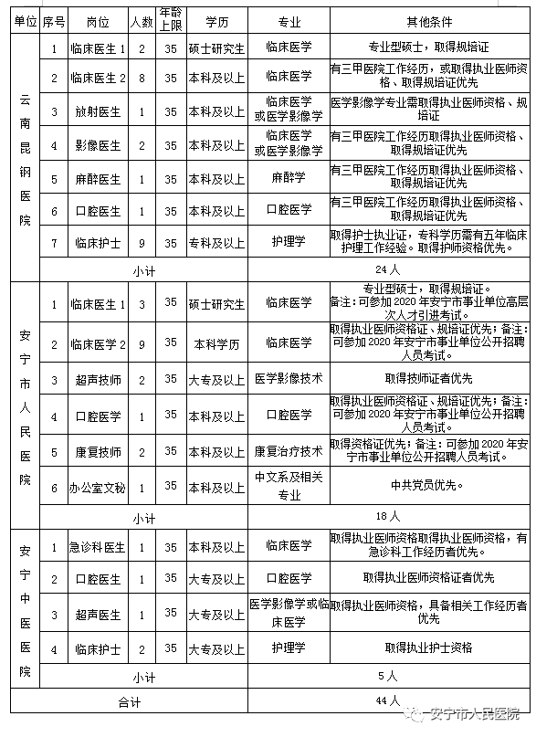 安寧市醫(yī)共體2020年工作人員(非事業(yè)編制) 招聘啟事